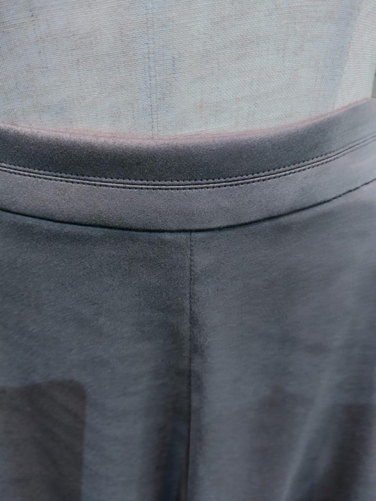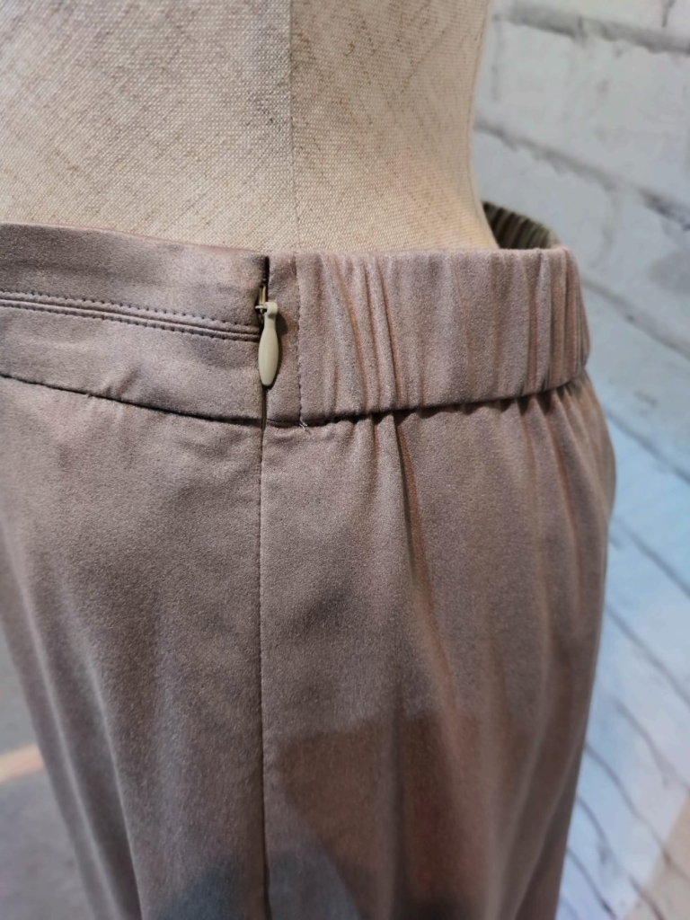 秋冬らしいスエードのような素材のスカートです。手洗い可能商品です。ジャケットに合わせやすい6枚はぎのデザインで、ヒップ周りはゆとりがありながら、裾に向かって広がらないようなデザインで上品なシルエットです。ウエストに切り替えが入り飾りステッチが入っています。