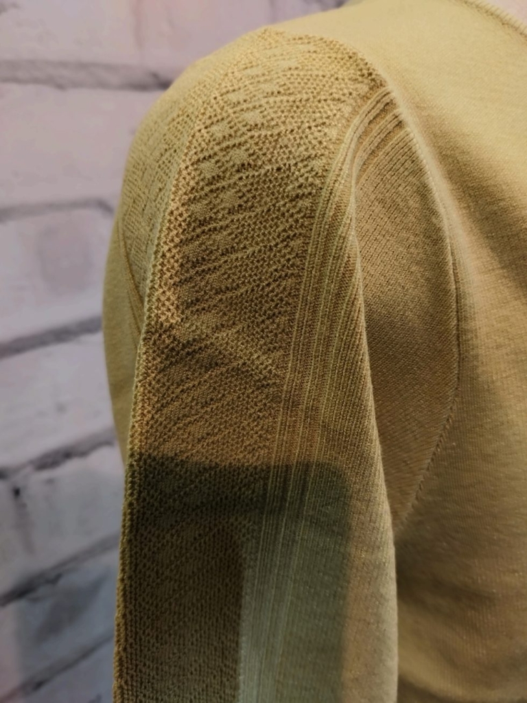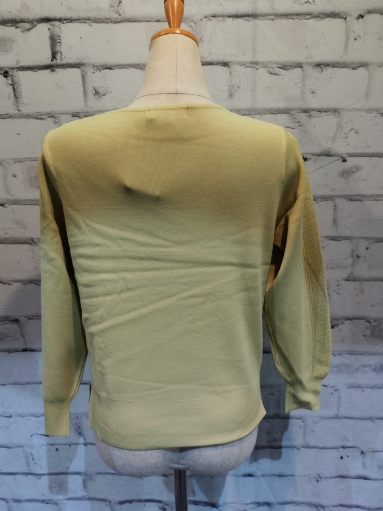 程よい肉感のニットで1枚着でもジャケットのインナーでも使えます。袖の上品な織柄とラインがポイントです。家でお洗濯できます。